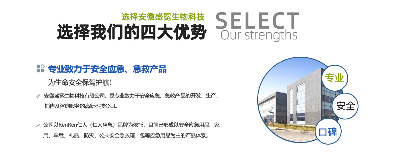 安徽盛冕生物科技有限公司专业致力于安全应急、急救产品的开发、生产、销售及咨询服务的高新科技公司。公司以RenRen仁人(仁人应急)品牌为依托,目前已形成以安全应急用品、家用、车载、礼品、防灾、公共安全急救箱、包等应急用品为主的产品体系。